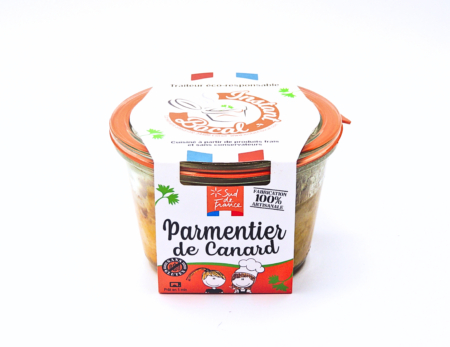 Ingrédients : Canard confit (France), pomme de terre, oignon, ail, herbes de Provence, beurre, lait, crème, emmental râpé, muscade, sel, poivre. Poids net : 230g.